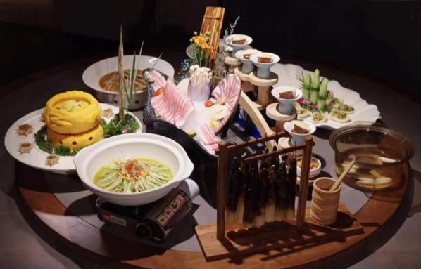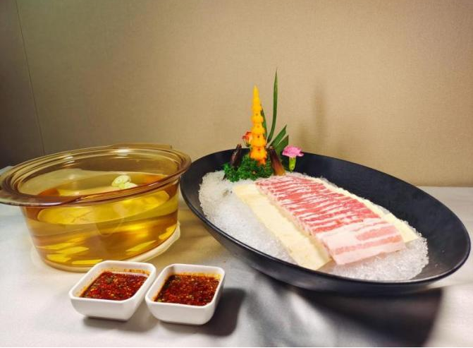 取土猪肉中的五花肉切薄片一份,鲜笋热汤一份,酱汁一份,搭配起来食用,味道鲜美可口。