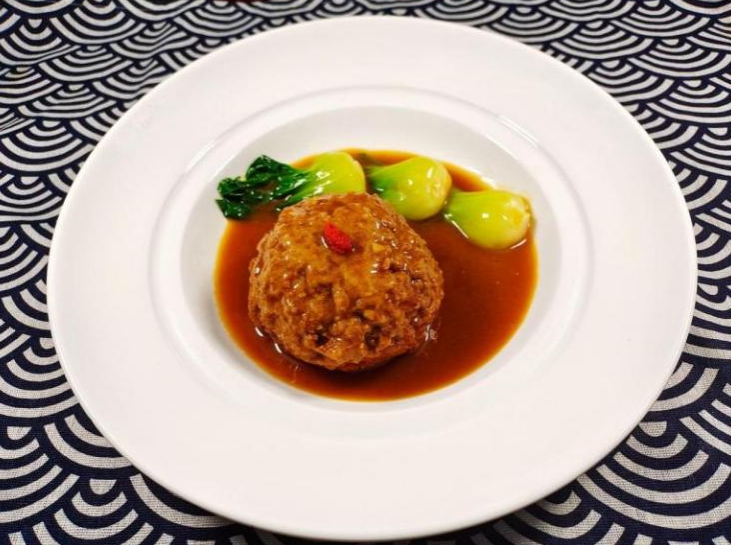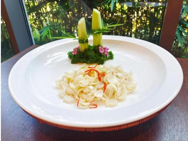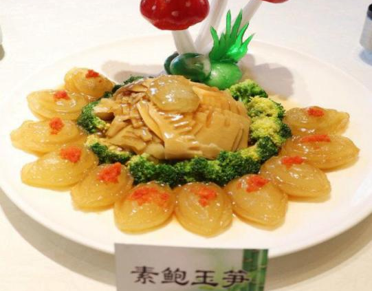 用冬瓜雕刻而成的素鲍,经秘制祖庵汤煨制入味,搭配脆嫩爽口而汁浓鲜香的笋片,造型美观,妙不可言,一口鲜活整个春天。