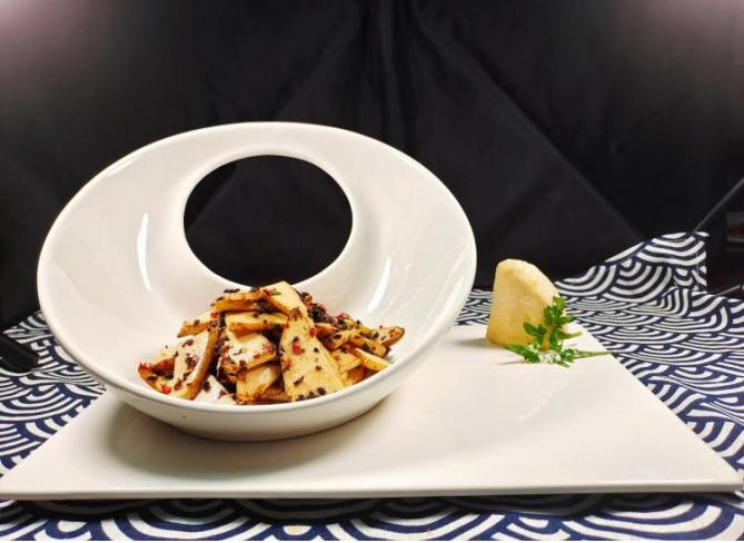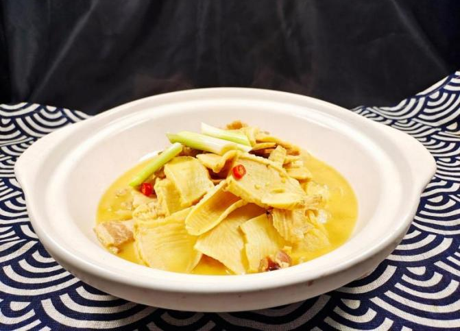 选用桃江本地新鲜肥美的春笋,经腌制加工后,放入自制的泡坛中浸泡,待其入味后捞出摆盘成菜,原汁原味、清清爽爽,犹如桃江的山水,百看不厌。