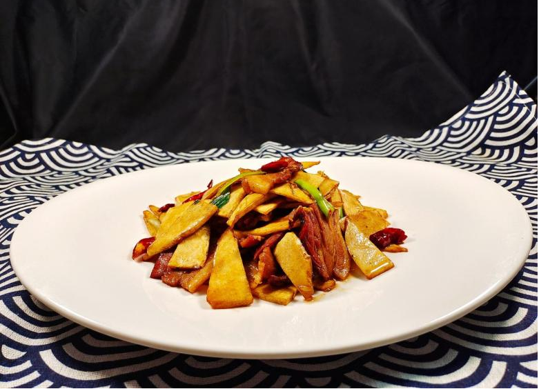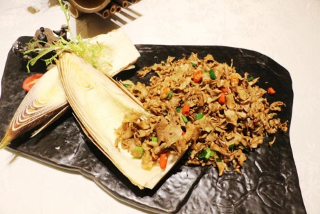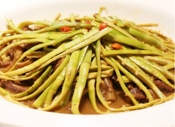 白牙笋和土猪风吹肉搭配在一起,风吹肉咸鲜,白牙笋脆嫩、笋香扑鼻。