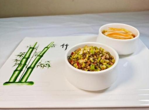 小笋,竹之幼芽,春从泥土出,嫩鲜可食。唐朝诗人李商隐《初食笋呈座中》道:“嫩箨香苞初出林,於陵论价重如金。皇都陆海应无数,忍剪凌云一寸心。”宋朝苏轼一首《浣溪沙》诗曰:“细雨斜风作晓寒,淡烟疏柳媚晴滩。入淮清洛渐漫漫,雪沫乳花浮午盏。蓼茸蒿笋试春盘,人间有味是清欢。”宋朝范成大也诗云:“窗间梅熟落蒂,墙下笋成出林。连雨不知春去,一晴方觉夏深。”三首古诗都道出了笋是春天最好的精灵,他的香气为天地化育。论鲜味不比蕨菜差,论香味更比香椿好。“妙笔生辉”为桃江竹笋宴之凉菜小笋,似笔挂龙门,故谓妙笔生辉。味道酸辣脆爽。