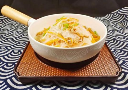 将白芽笋、豆干、胡萝卜切丝,准备好粉丝,红椒丝待用。锅内放猪油烧至六成热,倒入笋丝、胡萝卜丝爆炒柔软,倒入高汤烧开加入豆腐丝、粉丝把汤汁收浓,撒上红椒丝、葱花,吃起来清香爽口。本菜品是马迹塘和菜的创新菜,是桃江民间宴席习俗上“四底、四荤、四汤、四素”之四底必备菜之一,谓之“和菜”,寓意和和美美,和气生财。