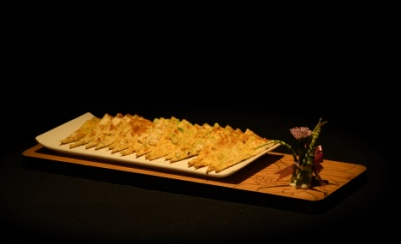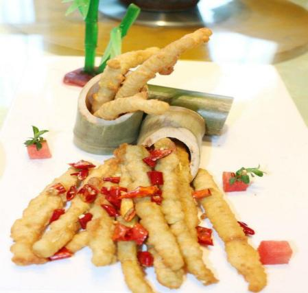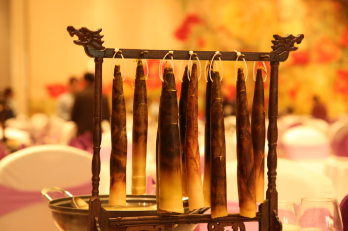 将小笋置入浓汤中小火慢煨入味,再将入味的小笋上浆后放入油锅内炸至金黄,撒些许椒盐,椒香酥脆。形似一支支金黄色的笔插在里面,寓意弘扬传统文化、书写完美人生。