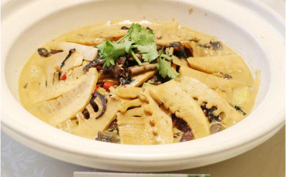 牧牛君子,竹下美人,是爱情的天仙配,也是菜肴的必搭品。脆嫩小笋辅以鲊埠牛腩,牛腩酥烂、小笋鲜脆,补中益气,滋养脾胃,好消化增食欲。