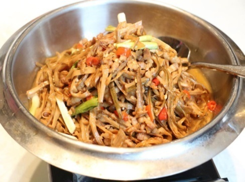 脱水笋用凉水浸泡12个小时,再用高压锅压制1个小时,等待的时间造就了如鲜笋般的肥嫩,用高汤煨制的猪肉浓醇而略筋道,为干锅而生的笋丝吸足了肉汁,原来新鲜就是榨笋的味道。