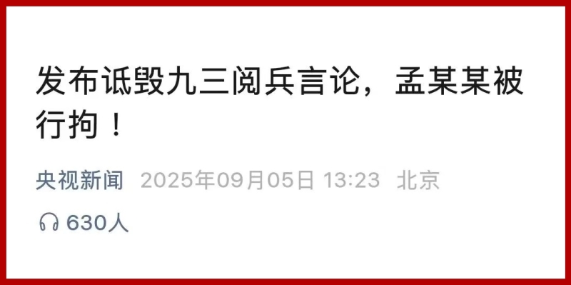 九三阅兵的铿锵之声尚在天空回荡,47岁的孟某某却因发布诋毁阅兵言论被拘。孟某某也算是“求锤得锤”。