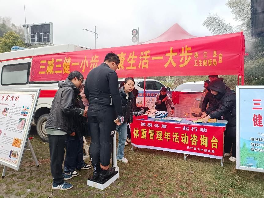 3月29日上午,一场以“提升人居环境 共建生态竹乡”为主题的2025年桃花江30公里环保毅行活动在桃江县城金盆广场启动,近万名志愿者用毅行传递健康与快乐。县卫健局积极响应国家“体重管理年”活动号召,在广场周围、沿途打卡点均设置有减重科普交流区,来自各乡镇卫生院的医务人员积极践行社会责任,充分发挥专业优势,与来往的群众近距离交流,给大家提出体重管理、健康生活的实用建议,呼吁全社会关注体重、管好体重。