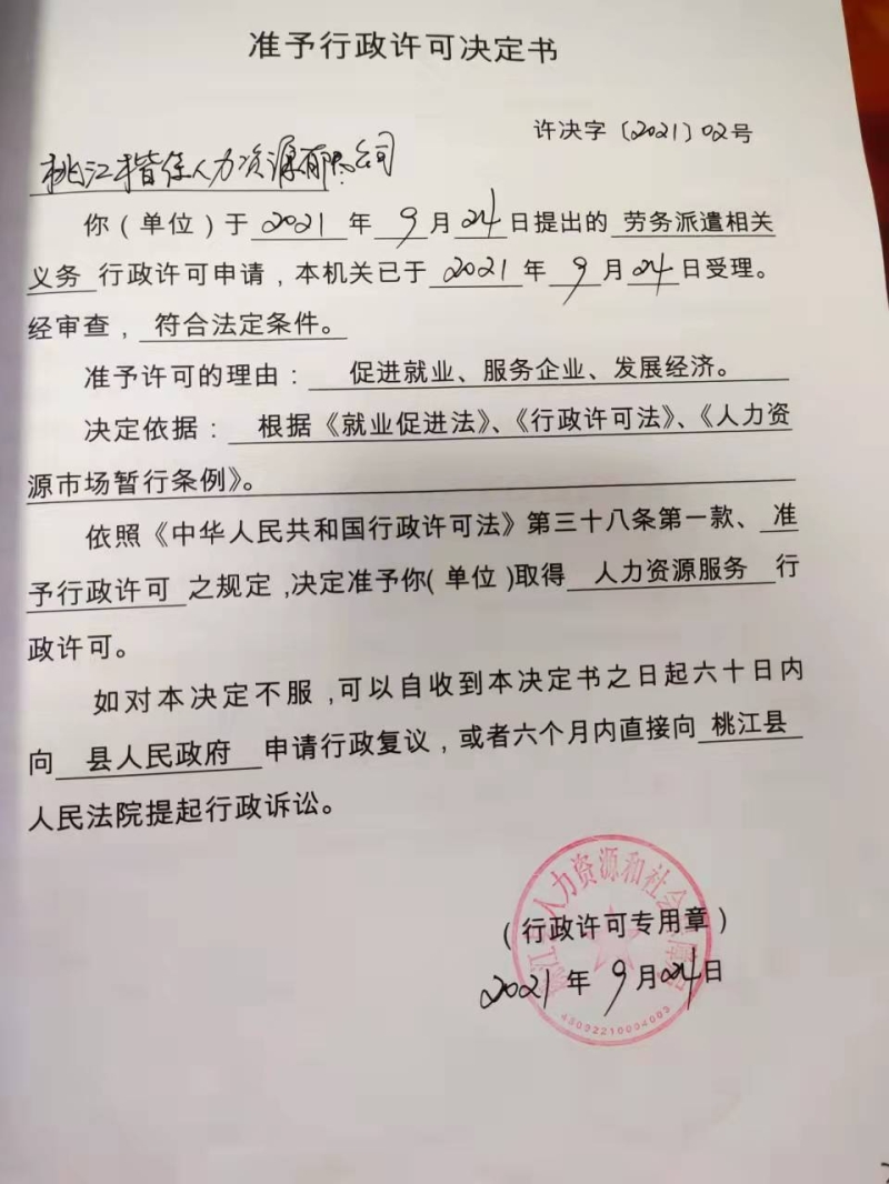 桃江县人力资源和社会保障局关于人力资源服务行政许可的公告(桃江楷佳人力资源有限公司)