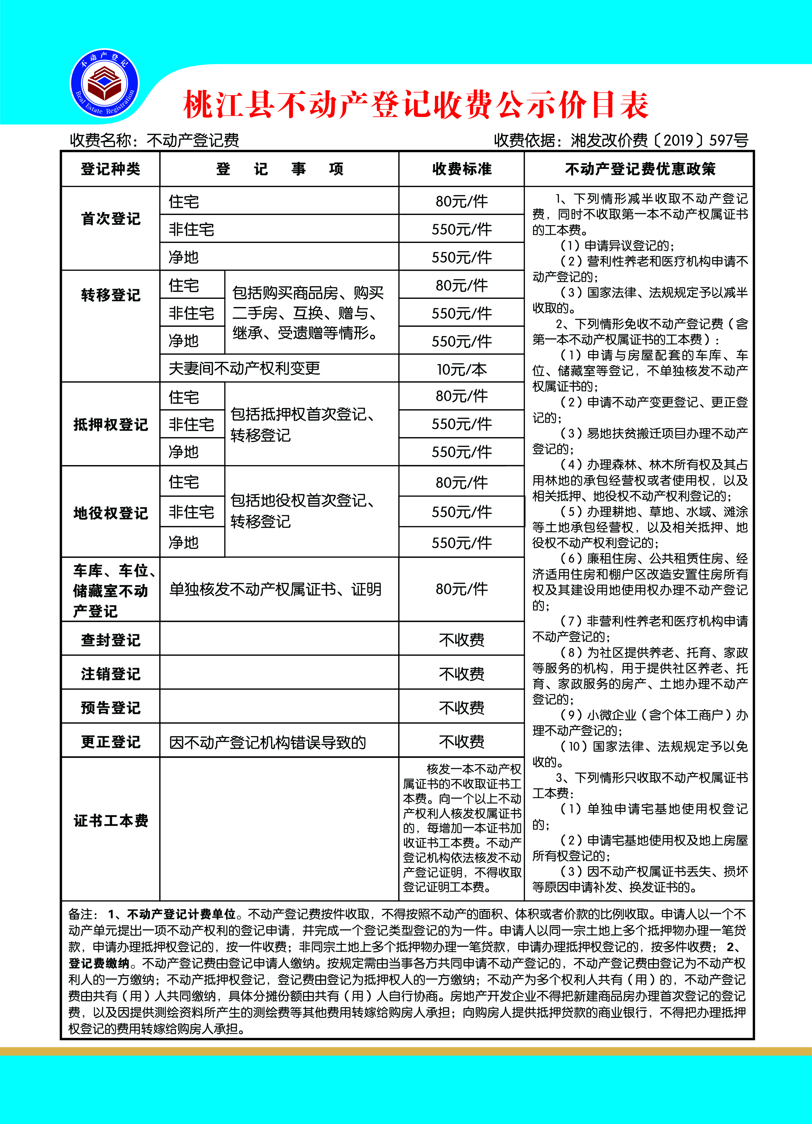 桃江县不动产登记收费公示价目表