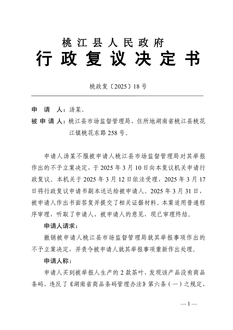 行 政 复 议 决 定 书桃政复〔2025〕18号