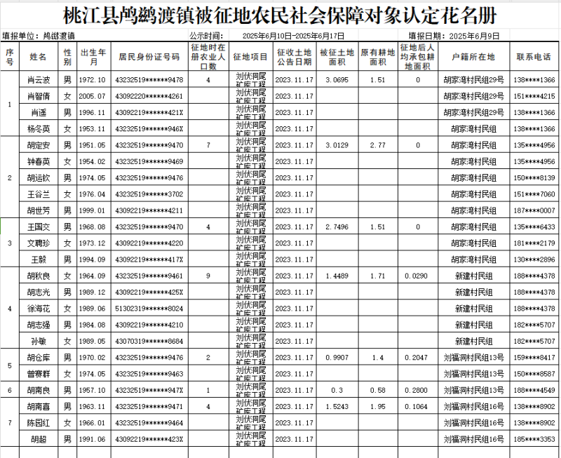 桃江县鸬鹚渡镇被征地农民社会保障对象认定花名册公示