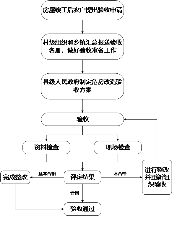 房屋竣工一个月内,县级人民政府组织住建部门会同扶贫、财政、民政、残联等相关部门完成农村危房改造验收工作。乡镇政府和村级组织应积极做好验收前的资料档案、台账、现场检查等准备工作。