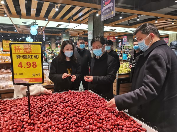 在世纪华联超市,张值恒走进商场内,了解大米、蔬菜、肉类食品的供货和销售情况,详细询问了商场负责人各类商品的货源组织、货品储备、市场价格以及超市运营等具体情况。张值恒指出,春节期间市场物资需求量大,桃江要在做好供应环节的基础上,切实保障商品物资流通环节和销售环节价格稳定工作,守好百姓的“米袋子”“菜篮子”。要毫不松懈地抓好疫情常态化防控,让人民群众过一个欢乐祥和、健康安全的春节。
