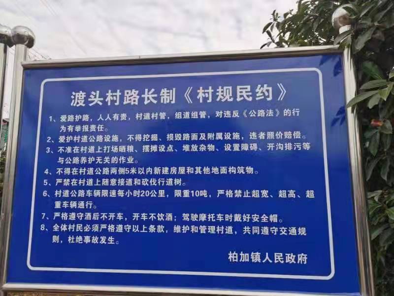 12月17日,由周登高县长带队的乡村振兴学习观摩团来到该村,一路走来收获不断。刚刚下车,跃入眼帘的是一块“路长制”的《村规民约》招牌,把爱路护路写入《村规民约》,包括“不准在村道上打场晒粮、摆摊设点……”“严禁砍伐行道树”,还有车辆限载限速等,非常具体。