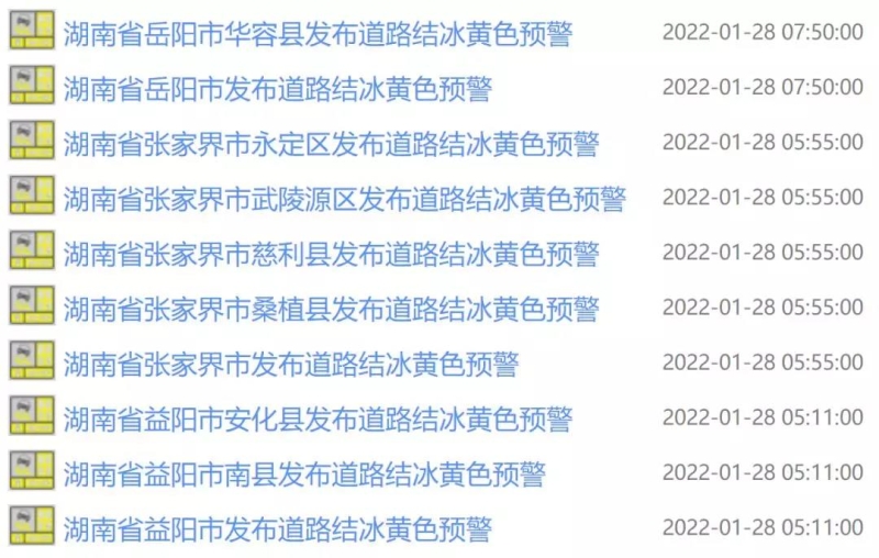 截至目前,湖南张家界、益阳、岳阳等多地发布道路结冰预警。