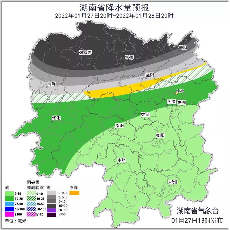 湘北中雨夹雪或冻雨转小到中雪,其中湘西州北部、张家界、常德、益阳北部、岳阳北部、怀化北部部分大到暴雪,其他地区阴天有小雨;北风3~4级;最高气温湘西北0~2℃,其他地区2~4℃;最低气温湘东南2~4℃,其他地区0~2℃。