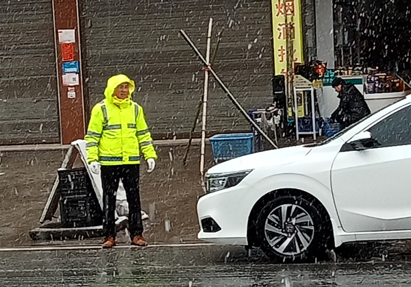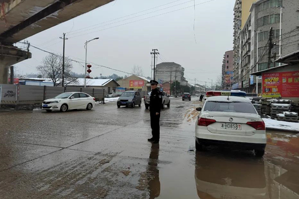 交警冒雪在路面值守