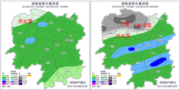 图1 湖南降水量及相态预报(左:2月16日,右:2月17日)