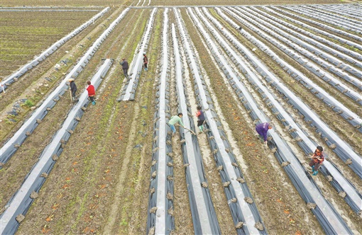 3月23日,道县梅花镇宜阳村,农民在田间覆盖地膜。连日来,该县一边严密防控应对疫情,一边铆足干劲开展春耕生产。 蒋克青 李昊璋摄影报道