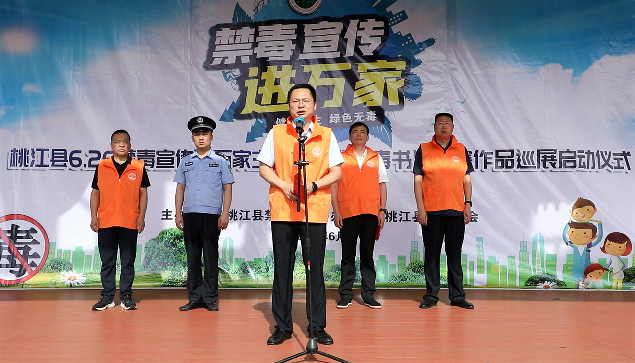 今年6月26日是第35个国际禁毒日。6月23日上午,桃江县6.26禁毒宣传进万家暨禁毒书法大赛作品巡展在大汉广场公众大舞台正式启动。县委副书记、县长、县禁毒委主任周登高出席启动仪式并致辞,县委常委、县委政法委书记罗歆辉主持启动仪式,副县长、县公安局局长、县禁毒委常务副主任吴斌领读禁毒誓词,县政协副主席蒋胜丰出席。