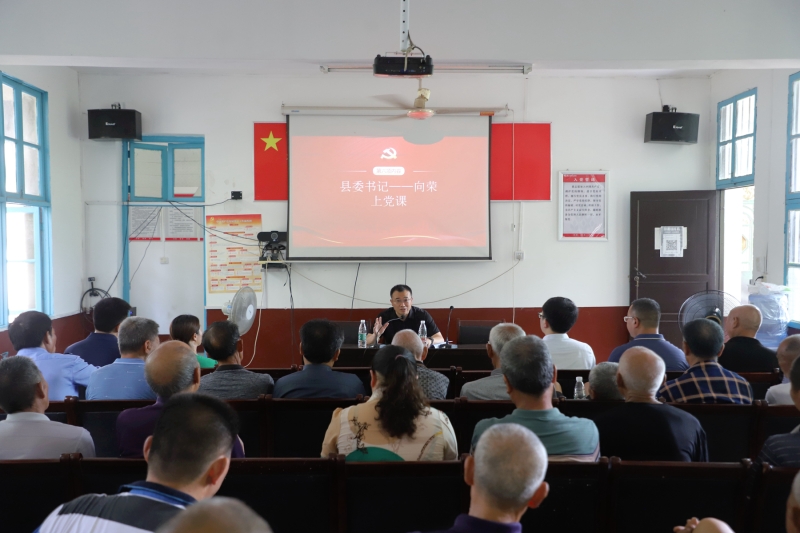 6月30日下午,县委书记向荣到联点村灰山港镇檀树界村参加主题党日活动,为全村在家党员上专题党课。