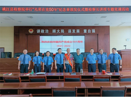 日前,桃江县检察院举行“光荣在党50年”纪念章颁发仪式暨检察长讲授专题党课活动。县检察院党组书记、检察长喻勇刚参加活动并作专题授课。