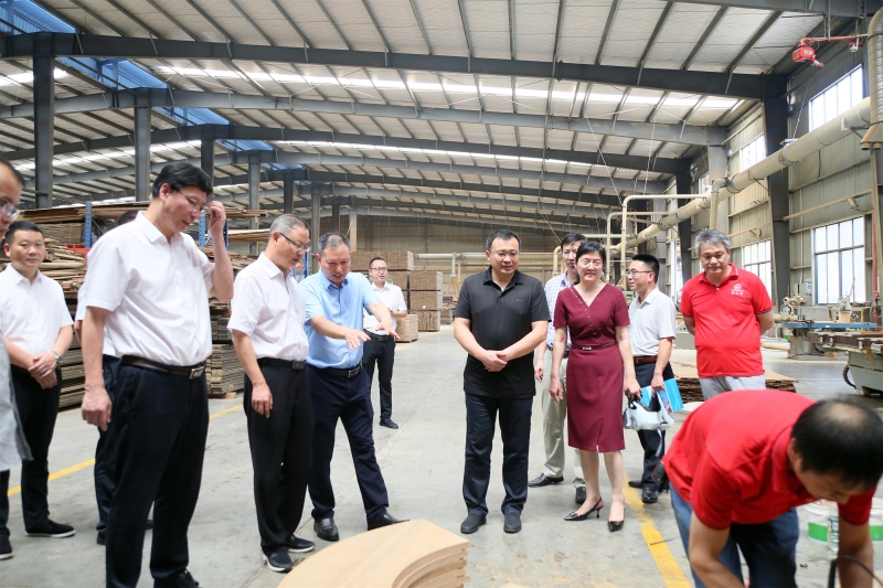 在桃花江竹材科技股份有限公司,考察团深入企业生产车间实地查看,详细了解企业产品生产工艺流程、研发投入、科研团队建设、科技成果转化和研发方向等情况。