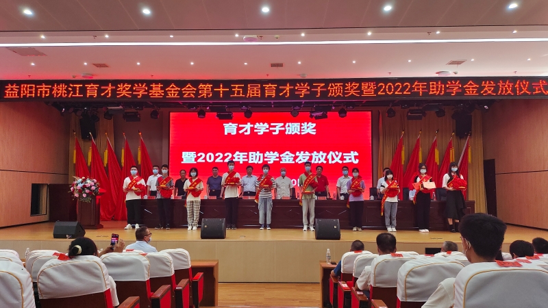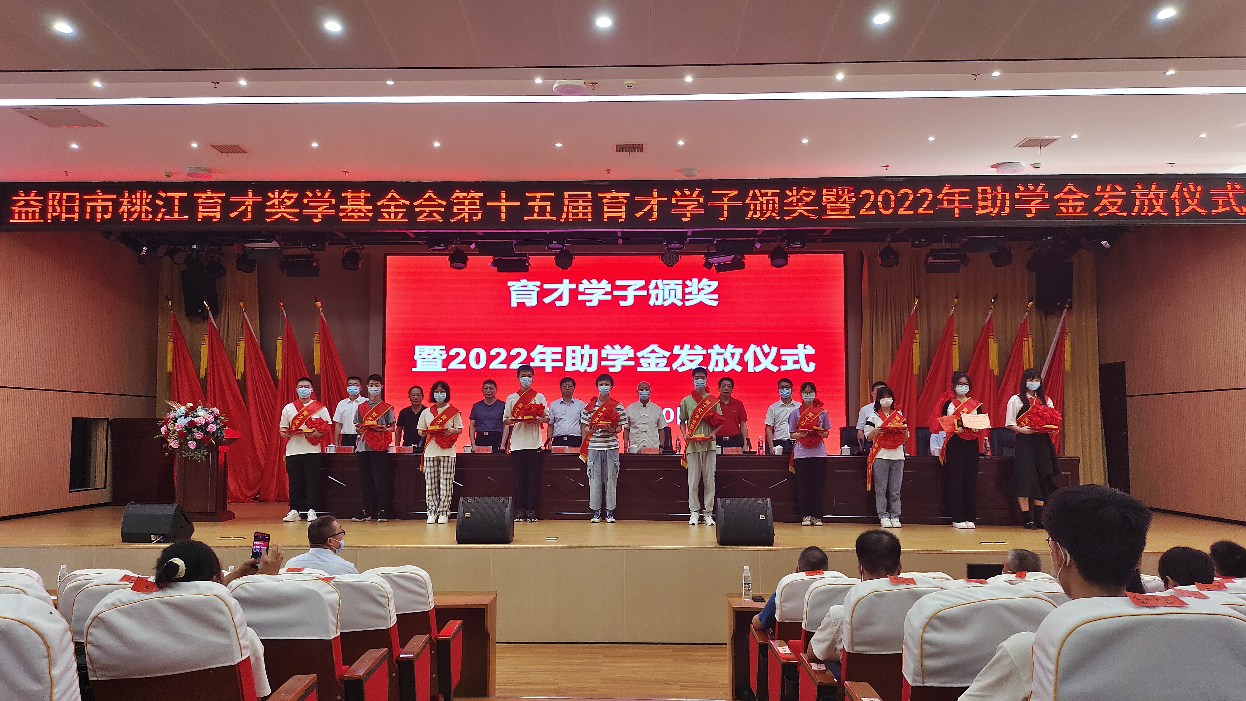 8月10日上午,桃江育才奖学基金会第十五届育才学子颁奖暨2022年资助金发放仪式在县教师发展中心举行。吴琲等10名大学新生和56名往届学子分别喜获1.5万元奖学金,10名家庭经济困难学子各获1万元助学金。原四十一集团军政委、桃江育才奖学基金会名誉理事长钟渭贤,市人大常委会原主任、市教育基金会理事长周再华,县委副书记、统战部部长、县委教育工委书记冷亮,县政协主席杨凯波,桃江育才奖学基金会理事长汪卫东、副理事长胡治国、秘书长王建钢等出席颁奖大会。