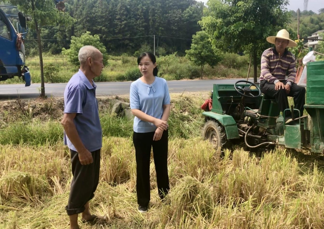 黄丽与正在收割水稻的农户交谈,了解旱情、粮食收成等情况