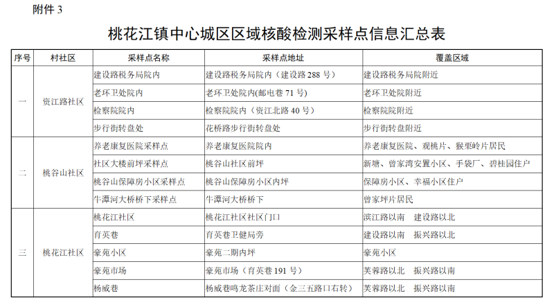 根据《桃江县新冠肺炎疫情防控指挥部医疗救治组关于中心城区常态化疫情防控下区域性核酸检测方案》,结合我县实际情况,共设置94个采样点(详见附件),请辖区内居民按社区通知到指定地点采样。