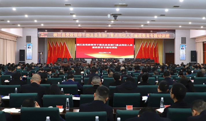11月27日上午,桃江县党政领导干部及县直部门重点岗位人员廉政教育专题培训班开班,县委书记向荣作动员讲话并为430名党员干部讲授廉政党课,县委副书记、统战部部长冷亮主持。