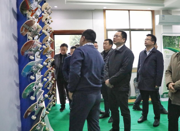 周登高一行先后考察了湖南丰源体育科技有限公司、湖南中集新材料科技有限公司、湖南九通竹基复合材料制造有限公司和绥宁县赤木滩竹海科普示范园。