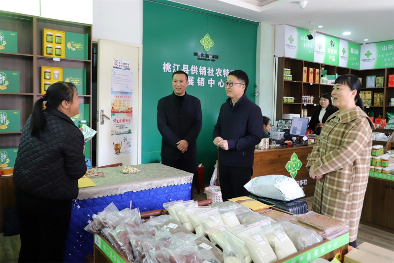冷亮先后来到县供销社农特产展销中心和县供销合作社,通过实地查看、听取汇报和座谈交流,详细了解我县供销社综合改革情况。2023年以来,桃江县供销社牢记为农服务宗旨,持续深化供销社综合改革,探索新供销服务模式,拓展服务领域,完善全县再生资源回收体系,回收处理废旧物质和有毒有害农村废弃物达22000吨。建立“两个到户”实体平台198个,线上平台202个,联结农户10.28万户,服务农户15.21万户。开展社会化服务面积达61万亩,完成了市定全年50万亩任务的122%,完成农业生产社会化服务标准面积1.819万亩,超额完成市级下达我县5000吨化肥淡储任务。