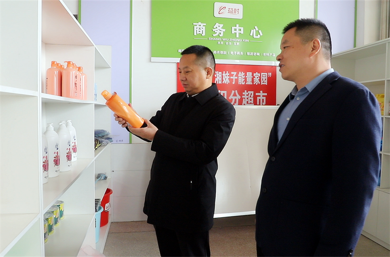 黄军在新桥村公德爱心积分超市查看商品情况 李丹 摄