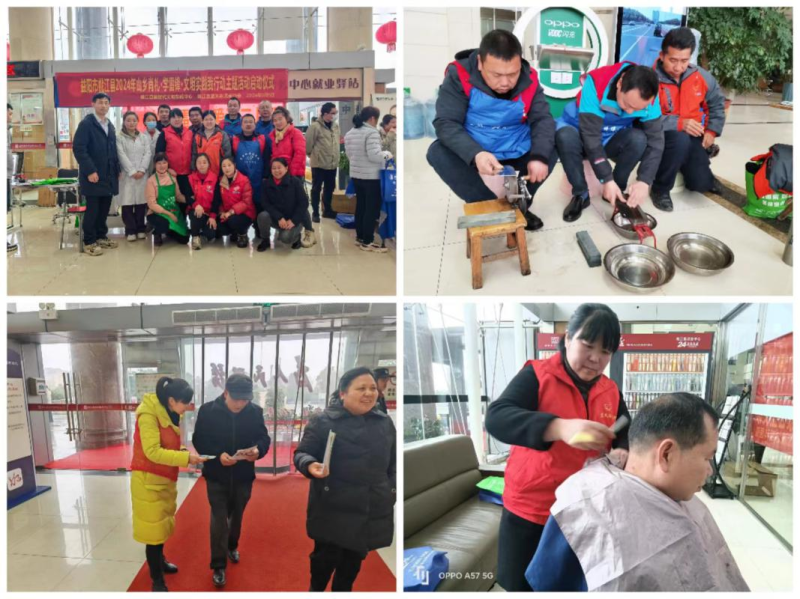 在县政务服务中心分会场的文明集市,志愿者们热情高涨,他们身穿红马甲,向过往群众分发宣传单、提供义诊、理发、磨刀和缝补衣物等多种志愿服务。