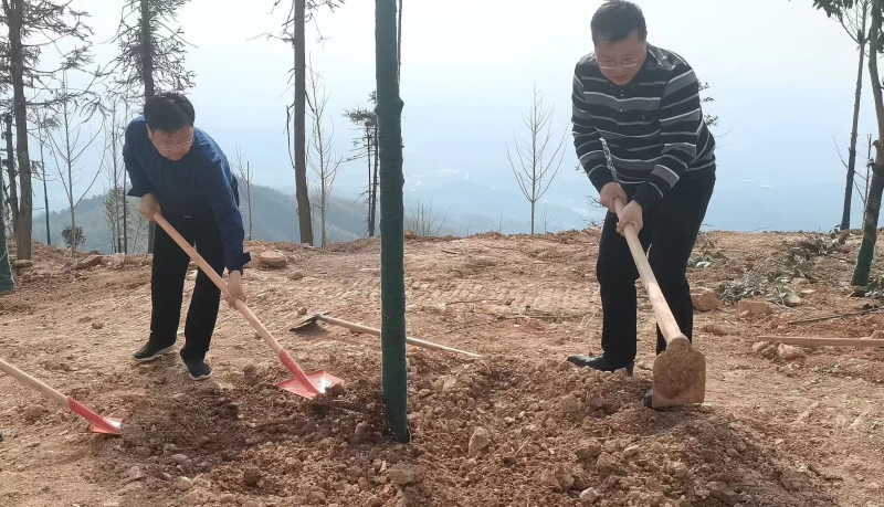 在浮邱山国有林场植树点,参加植树活动人员热情高昂、干劲十足。大家三五成组,分工协作,或挥锹铲土,或扶苗浇水,现场一派忙碌的劳动景象。经过他们的共同努力,一株株银杏树挺立山头,为浮邱山增添了一份新绿。