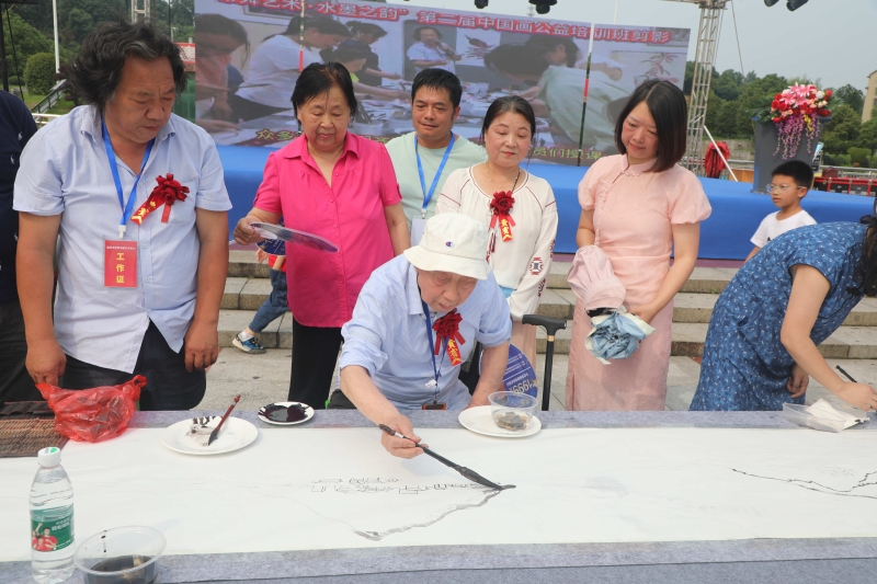 活动现场,高希舜在南京美专唯一存世嫡传弟子、96岁高龄的符竹书兴致勃勃地与老、中、青、少、童五代百余名书画艺术家和书画爱好者一同挥毫泼墨,共同绘制桃江十景“山水桃花江”百米长卷。两个多小时后,在他们灵动而充满艺术魅力的笔触之下,一幅集合稚气、朝气、大气、豪气于一体的桃江山河书画卷呈现了出来,尽显希舜艺术传承之风采。