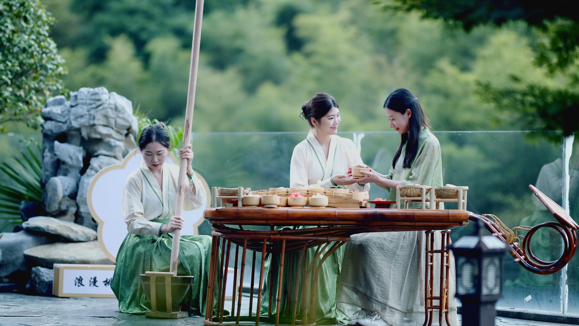 青罗裙裾拂过千年竹浪,三姝素手点茶香染流云。竹影婆娑间,黛檐石矶笼着胭脂颊,一盏清茗盛满武陵风月。赴这场竹香萦绕的邀约,让山水为妆,竹涛为曲,时光作笺,共醉竹韵诗境。