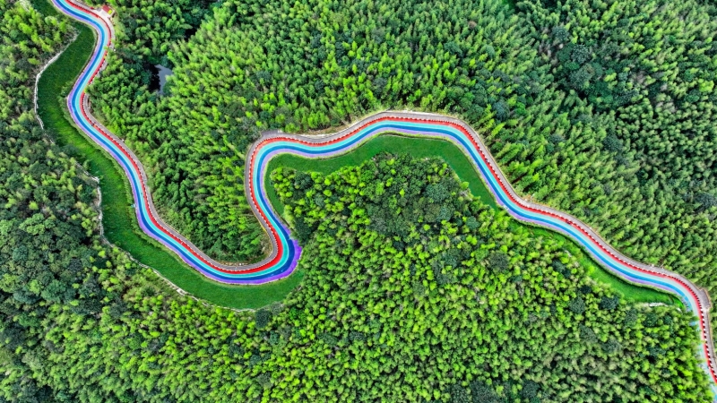 沿着竹海鲜亮的彩虹大道蜿蜒而上,您看到脚下的红色洋溢着热情,绿色呼唤着环保,蓝色憧憬着自由,紫色倾诉着浪漫。这一步一步走进竹海,您就是踏上了向往自由、奔赴山海的旅程。