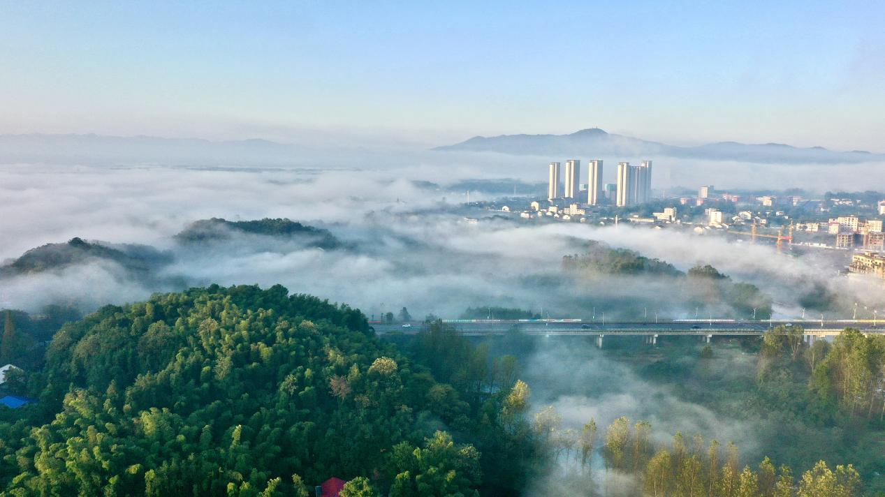 摄影师镜头下清晨的桃江,仿若仙境。层层云雾在山峦间缭绕,似轻纱曼舞。郁郁葱葱的山林在云雾下更显生机,远处楼宇高低错落,山脉朦胧,展现出桃江独特的山水交融之美。