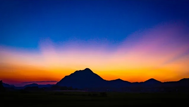 黄昏时分,天空被染成绚丽的色彩,从深蓝渐变到橙黄、粉紫,层次丰富。羞女峰在晚霞中勾勒出清晰的轮廓,整个画面静谧壮美,尽显大自然的瑰丽与神奇。