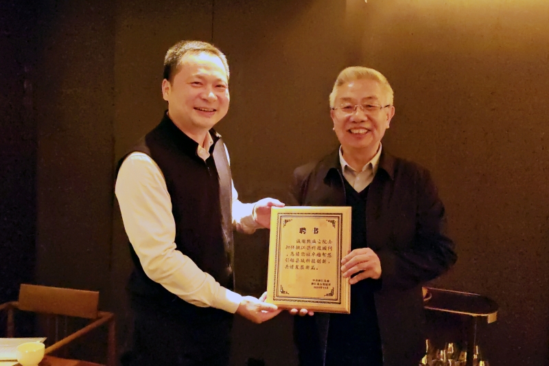 图为县委书记周登高(左)向熊盛青院士(右)颁发聘书