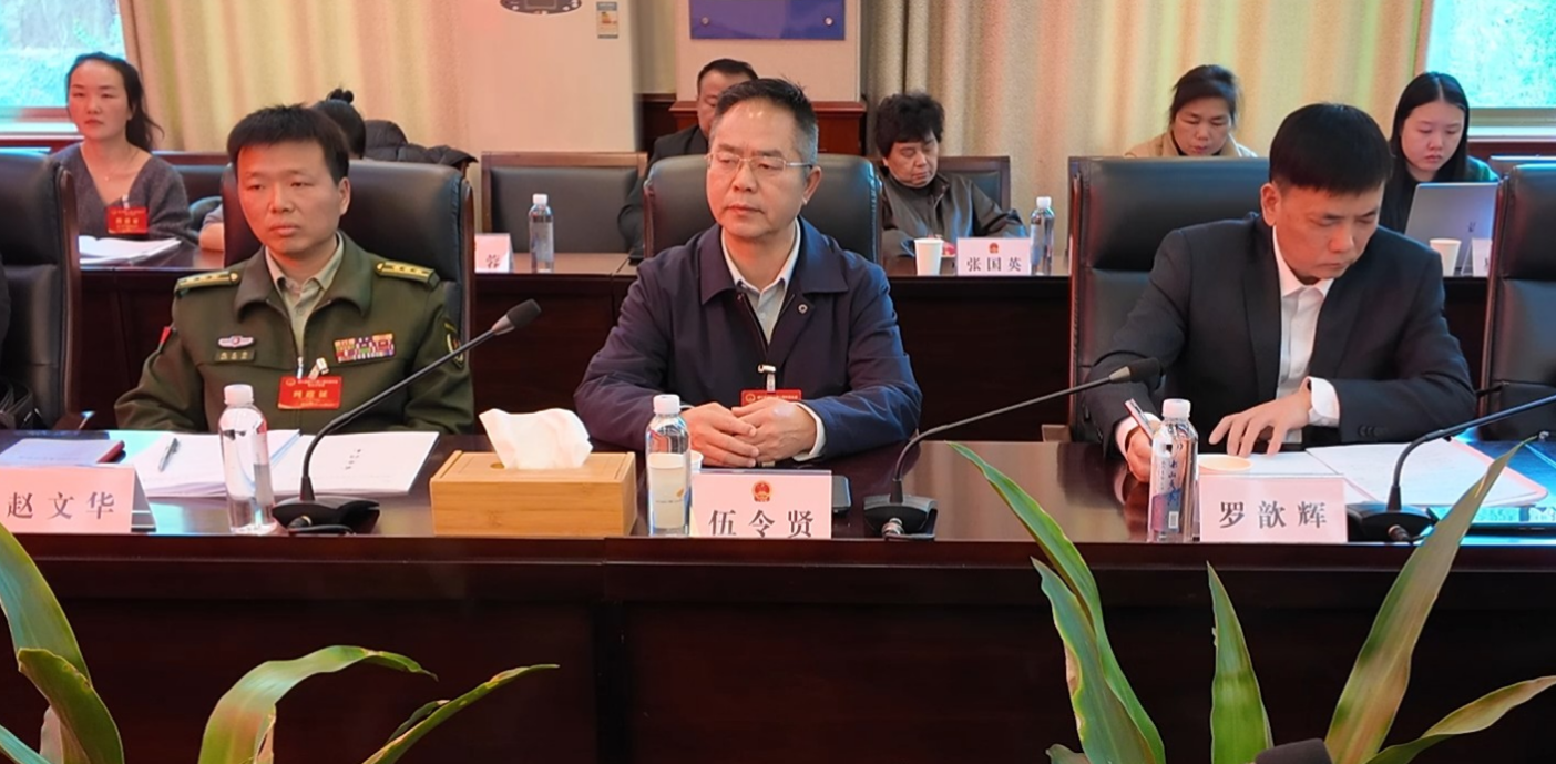12月19日下午,县人大常委会主任伍令贤到县十八届人民代表大会第五次会议第四代表团讨论会场,与代表们一同审议“一府两院”工作报告,审查县“十五五”规划纲要(草案)。县委常委、政法委书记罗歆辉,县人武部政委赵文华参加审议。
