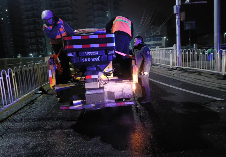 面对低温雨雪冰冻天气,县城管局聚焦城市交通关键节点,组织专业队伍对城区主要桥梁开展撒盐除冰作业,确保桥梁路面无结冰、无积雪,保障市民出行安全。