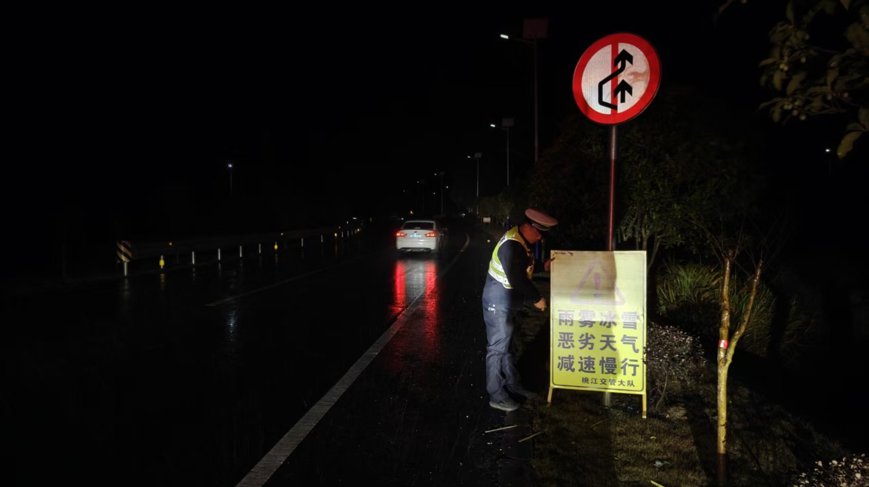 1月19日晚,灰山港镇平安法治办、应急管理办、交警中队等在神仙坳设置警示提示牌 灰山港镇 供图