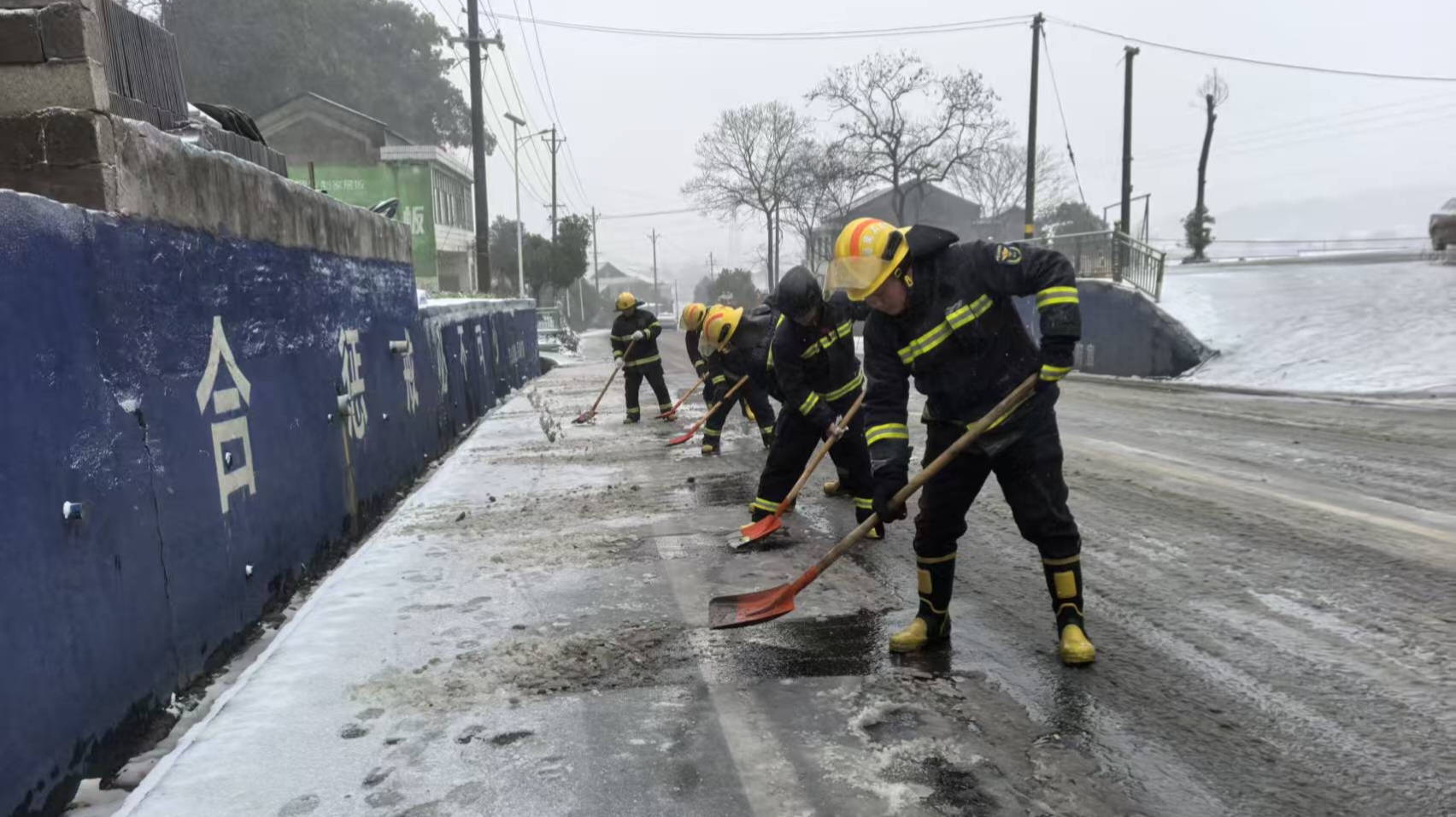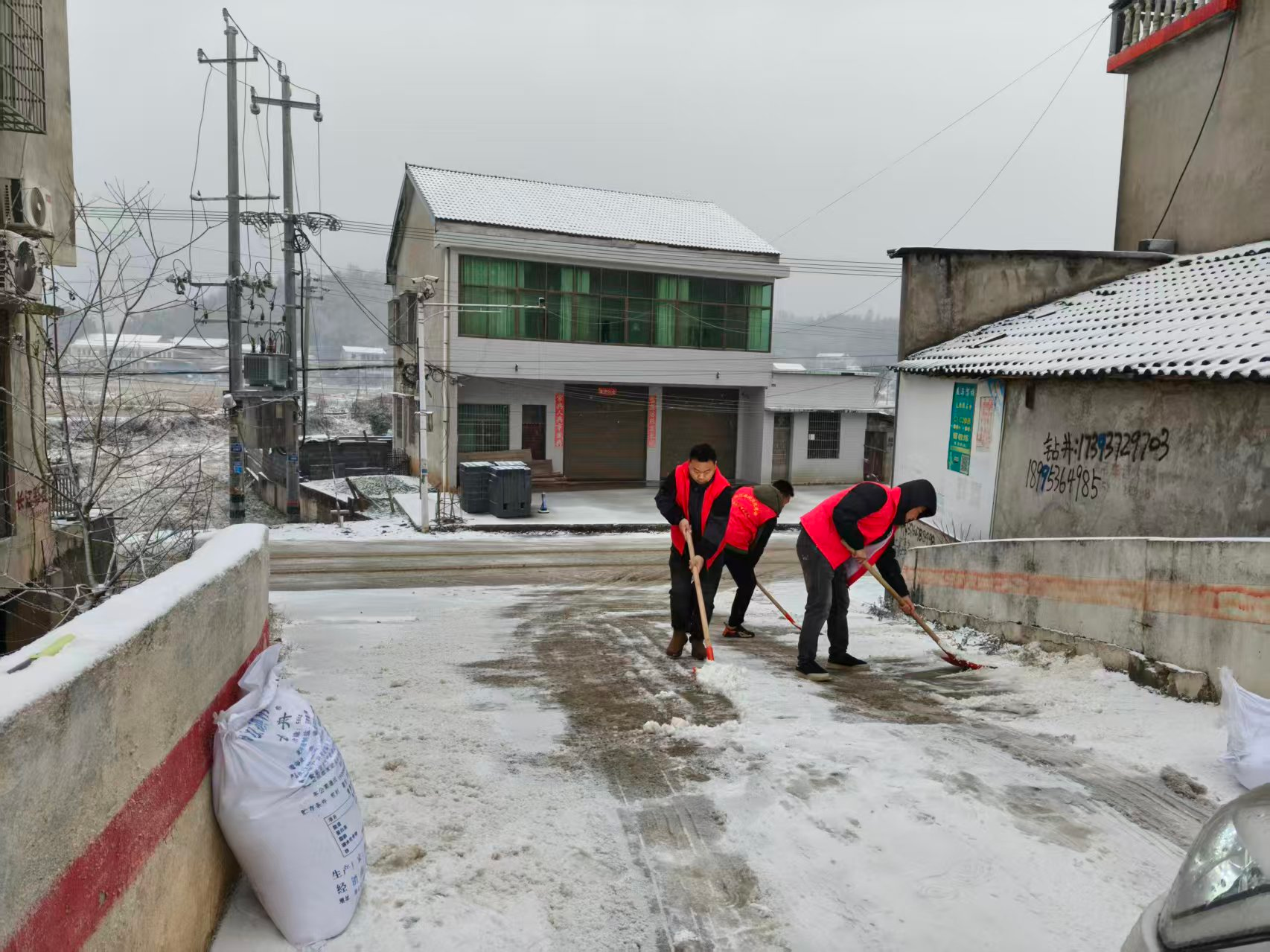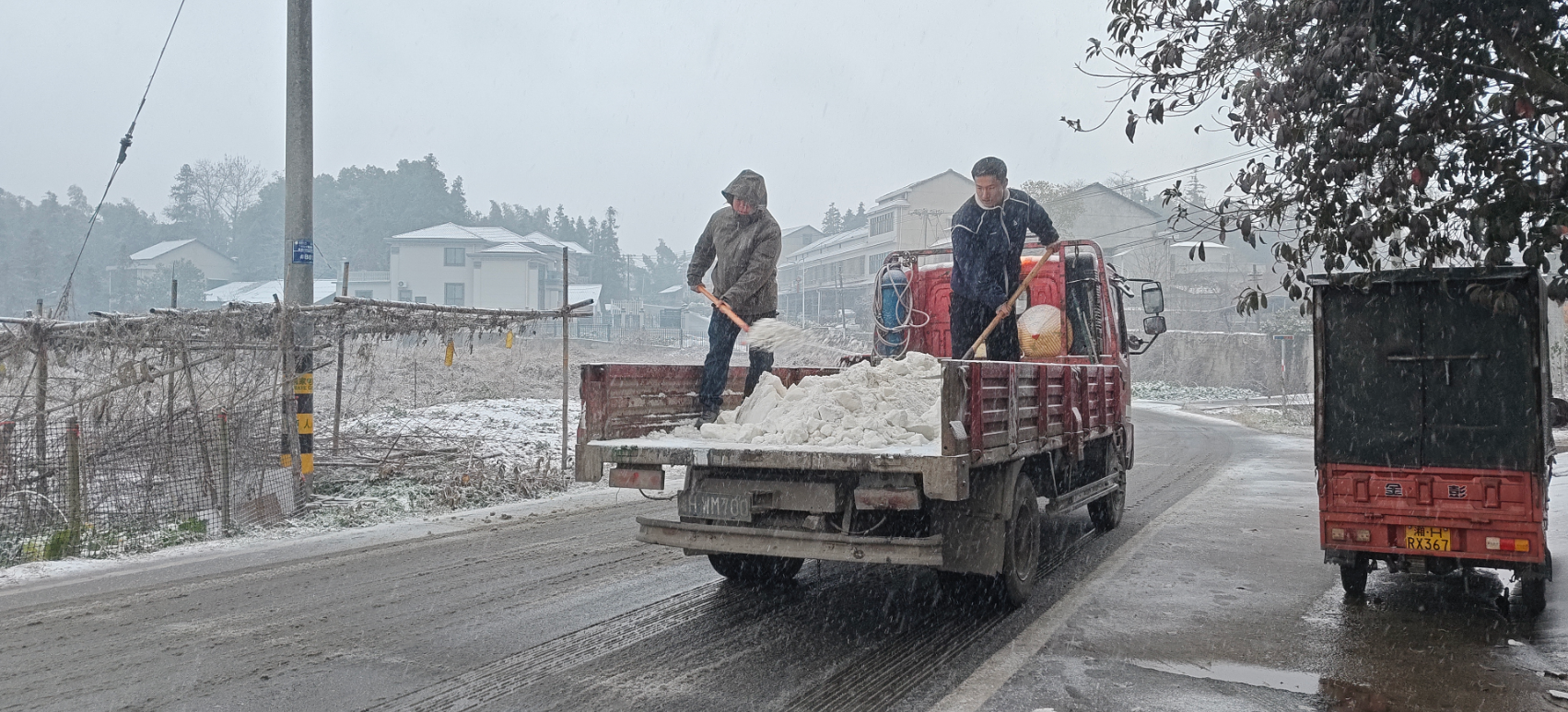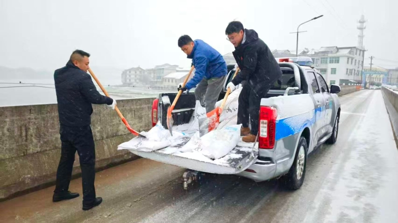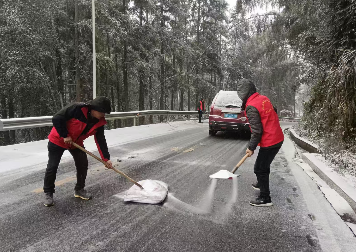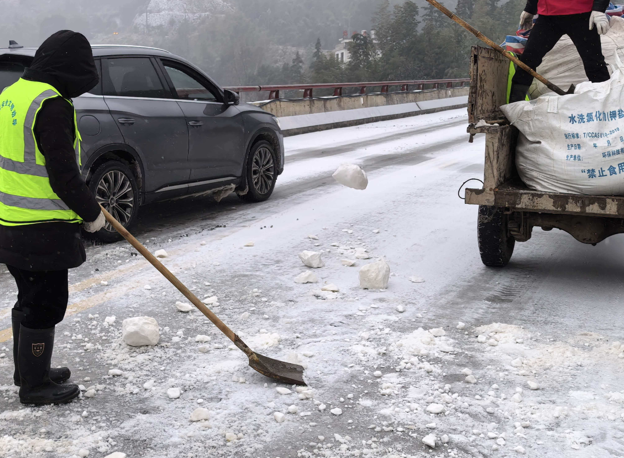 鲊埠回族乡军工嘴村路段撒盐除冰保障通 冷佳仪 摄