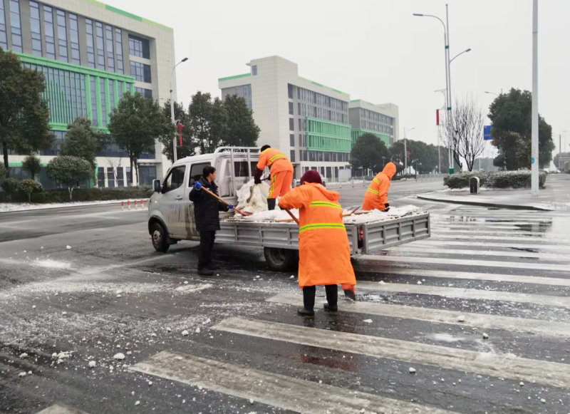 县竹乡公司联合物业公司对园区内道路进行撒盐破冰除雪行动,全力保障园区企业安全生产