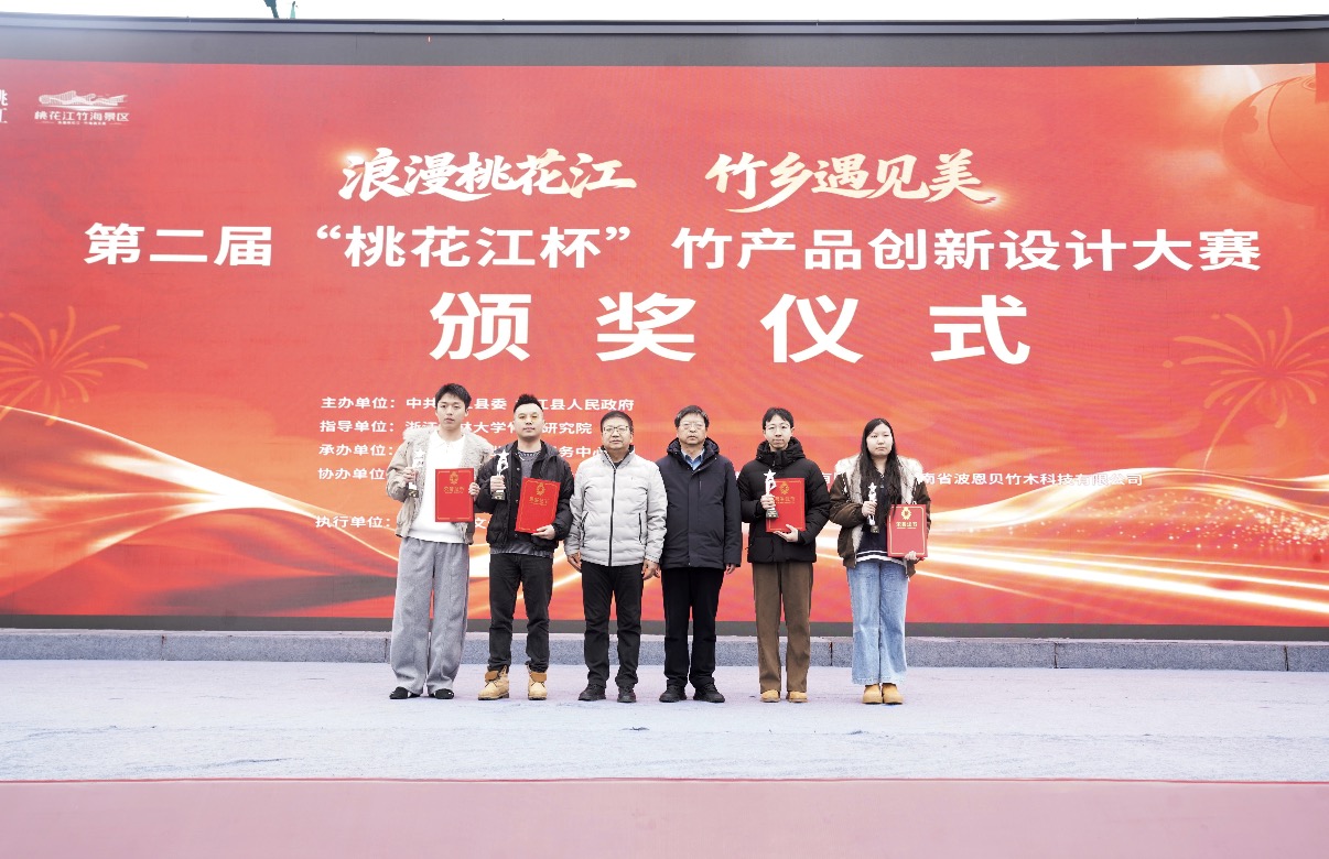 3月3日下午,第二届“桃花江杯”竹产品创新设计大赛颁奖仪式在桃花江竹海景区举行。经过激烈角逐,秦勇的《拾光》与胡波的《扇·竹馆》从710件作品中脱颖而出,摘得金奖。县委副书记、县长沈澍,县政协主席杨凯波为获奖选手颁奖。