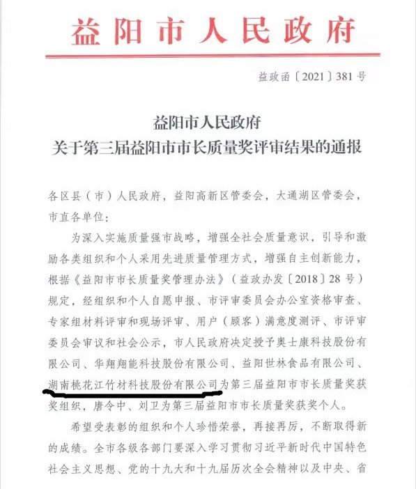 近日,益阳市人民政府公布了第三届益阳市市长质量奖获奖名单,桃江县湖南桃花江竹材科技股份有限公司榜上有名。