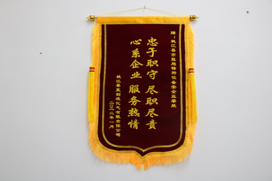 1月17日,桃江县蓝剑液化气有限责任公司将一面印有“忠于职守、尽职尽责、心系企业、服务热情”的锦旗送到县市监局特种设备安全监察股,对他们在日常的工作中帮助企业完善管理制度、规范充装流程、排查整治风险隐患、妥善处理群众投诉表示感谢。